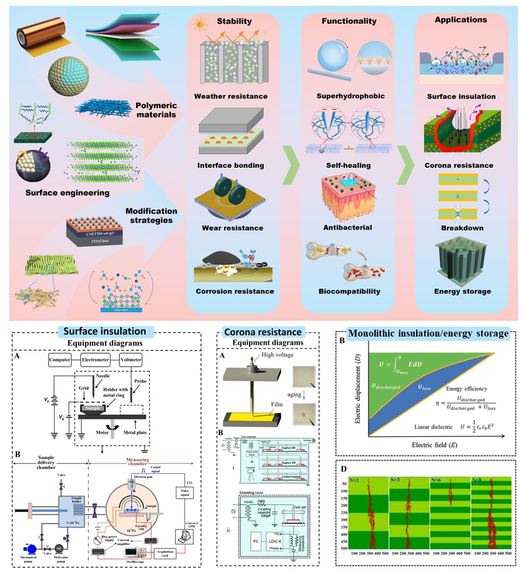 聚合物材料具有优异的绝缘性能、低的介电损耗、质轻、柔性、以及好的可加工性等特质,因而其在高性能电子电气设备中扮演着至关重要的角色。目前,007足球 贾申利教授的先进电工材料与新型电气设备团队重点关注和研究能源电力行业中的电气设备,包括真空开关/断路器、电容器、变压器、电缆组件、大型发电机等。典型的几种聚合物材料改性策略如单体/分子结构设计,聚集态结构调控,纳米复合强化已经取得了一系列的研究进展。然而,已有研究总是忽略聚合物材料绝缘失效往往是从表面开始,且高频电场将明显加速失效历程。聚合物材料表面改性工程是一种快速、低成本、可扩展的策略,从而在解决上述关键问题上具有独特的优势。因此,本文讨论和分析了表面改性工程引入的特定表面形貌、物理化学结构、电荷传输行为等如何提升聚合物材料的多尺度绝缘性能(从表面到内部以及高频电场应用环境)和介电储能性能。同时,聚合物材料表面改性工程多功能性和稳定性的协同构筑是未来先进电工材料多应用场景和高性能应用的发展趋势。
