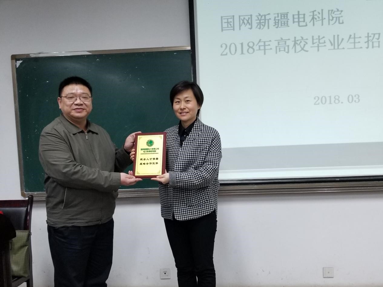 “国网新疆电力有限公司电力科学研究院校企人才供需战略合作伙伴”的称号。授牌仪式结束后,魏伟主任对国网新疆电科院的地理位置、职责职务、福利保障、应聘流程等方面进行了详细介绍,并耐心解答了现场同学们的提问。