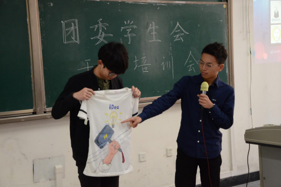 干训会上,各部门干事代表依次上台展示合作手绘的T恤成品。干事们在T恤图案的设计中,结合了电气信息007足球