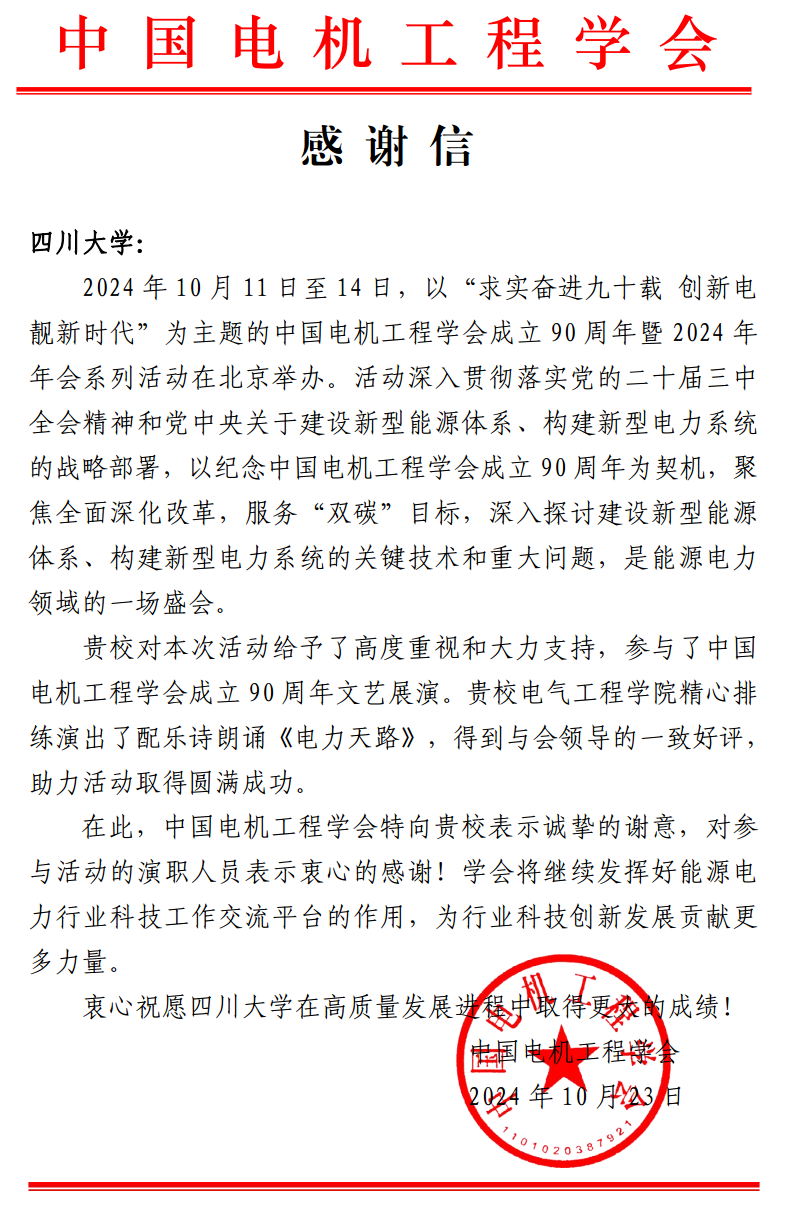中国电机工程学会向学校和参与活动的两位教师对本次活动的大力支持致感谢信,表达了诚挚的谢意,并表示将发挥好能源电力行业科技工作交流平台的作用,为行业科技创新发展贡献更多力量。同时衷心祝愿四川大学在高质量发展进程中取得更大的成绩!