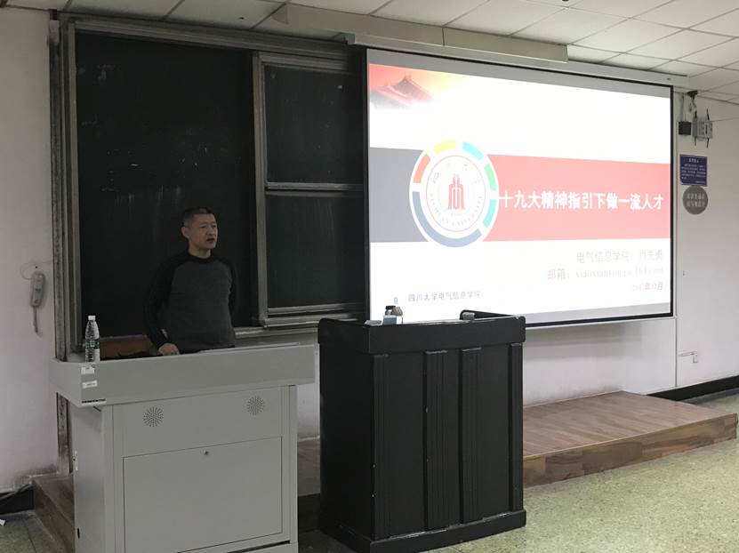 2017年12月15日晚,电气信息007足球 院长肖先勇教授走进2015级本科生的形势与政策教育课课堂,为同学们上了一节以“十九大精神指引下做一流人才”为主题的思想政治理论课。旨在学习贯彻十九大精神,号召大学生争做当代一流人才。007即时比分 2015级自动化、通信工程、医学信息工程三个专业全体本科生以及辅导员汤博老师参加了本次课程。