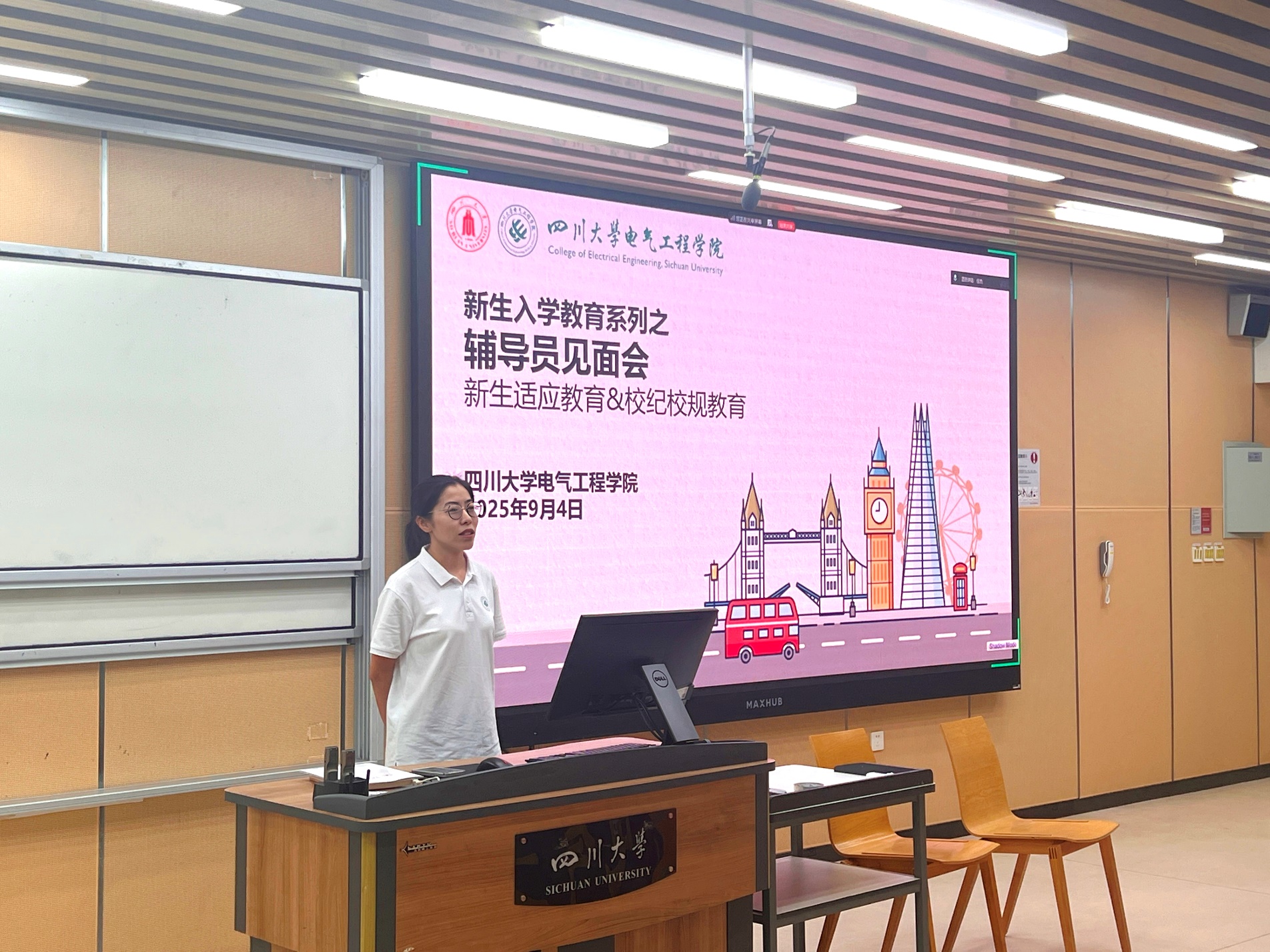 2025级新生辅导员任杰老师主持召开了校纪校规安全教育暨辅导员见面会。兼职辅导员赖远、门帝成,以及全体2025级电气类专业本科新生参与此次活动。任老师对同学们的到来表示热烈欢迎,她围绕“认识学校、007足球