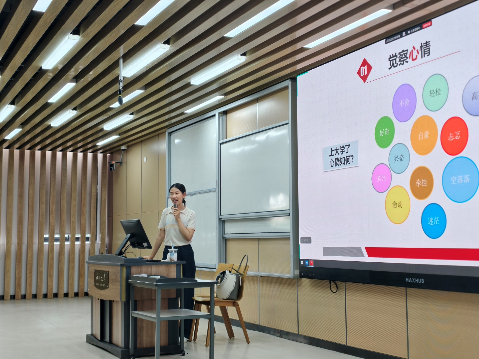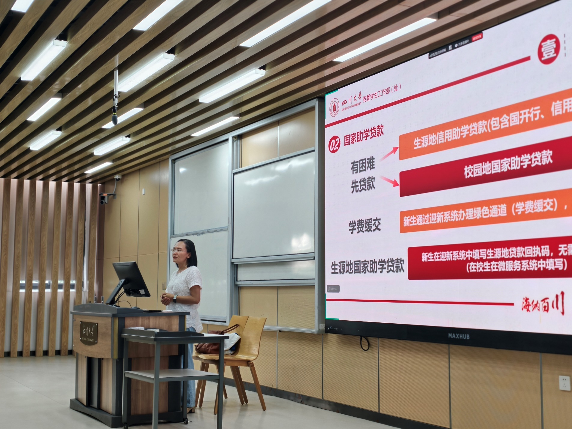 组织架构及常用联系方式,引导新生尽快完成角色转变,树立自我负责意识,做好自我关爱、自我保护和自我管理。任老师重点解读了《四川大学学生手册》中关于学籍管理、考试纪律、宿舍安全等规章制度,强调诚信意识和规则底线,鼓励同学们合理规划学业、积极适应大学生活,走好职业生涯的第一步。