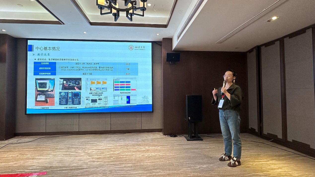 在分会场报告中,来自上海交通大学殳国华教授、厦门大学李继芳教授、东北大学肖军教授等多位教师代表分享了契合工程实际需求的实验课程教学体系建设经验。中心教师印月以“AI赋能电子技术实验课程数字化建设实践”为题作专题报告,分享了007足球