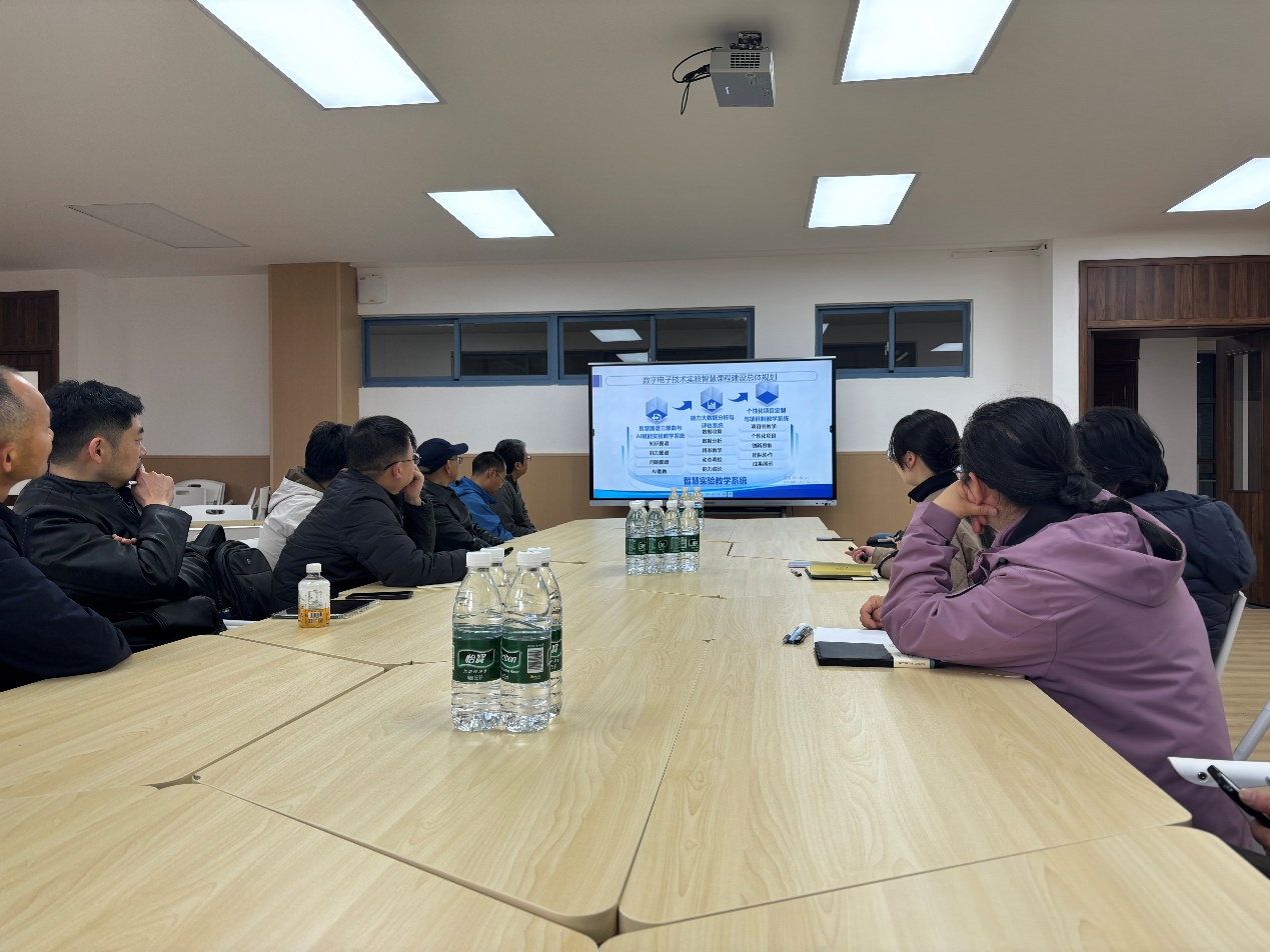 座谈交流环节,印月老师首先代表基础中心对西华大学同仁的到访表示热烈欢迎,详细介绍了基础中心的整体建设情况、师资队伍架构、实验教学体系布局及建设核心成果。重点分享了中心在AI赋能电工电子实验教学方面的实践探索与建设成效,从数字化建设规划、AI技术在实验教学与管理中的落地应用、智慧实验平台搭建等方面进行了细致讲解,让来访团队全面了解中心数字化转型的思路与成果。随后,双方教师结合各自教学实践积极提问、充分探讨,现场氛围热烈,实现了经验共享、思想碰撞。