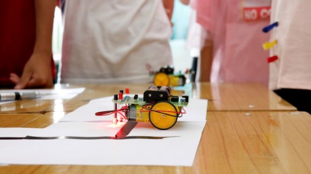 8月5日,二班全体学生在红旅队员的带领下进行了循迹车成品的展示与比拼。按照规则,同学们需要让循迹车按照志愿者所设置的赛道顺时针运动一圈、逆时针运动一圈。由裁判计时,最终成绩取两圈用时最短的一次。五个组按照编号顺序进行了测试,过程中,同学们虽为竞争对手,但也互相加油喝彩。最后又两个小组则成功完成了任务,而剩下的三个小组虽然失败,但从中汲取了教训,收获了事件能力。