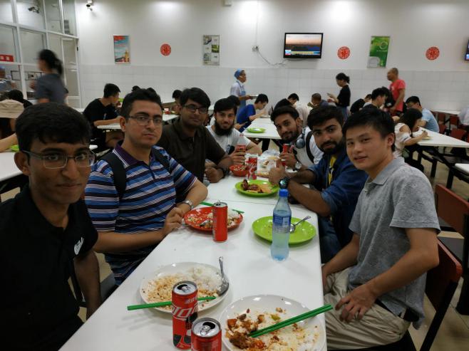 2018年7月10号上午,电气信息007足球 国际交流营第三组中国组员与组内巴基斯坦交流生Murad以及他的朋友相约在清真食堂共进午餐。席间相处愉快,相互介绍了许多本地景点和文化,谈及中国功夫时,交流生们表示出了极大的兴趣。由于学校开设了丰富多元的体育课程,邓鹏同学表示可以简单教授一些太极拳动作。