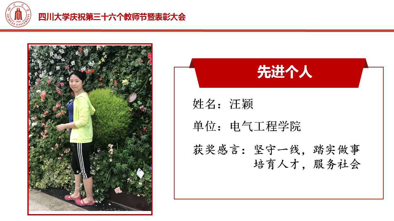 四川大学先进个人汪颖:坚守一线,踏实做事,培育人才,服务社会。