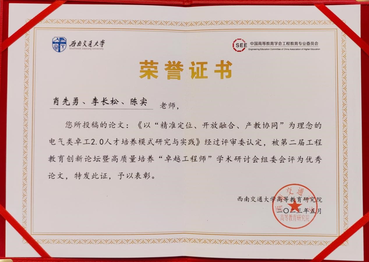 提交的论文《以“精准定位、开放融合、产教协同”为理念的电气类卓工2.0人才培养模式研究与实践》(作者:肖先勇、李长松、陈实)获评优秀论文,并由组委会颁发了荣誉证书。