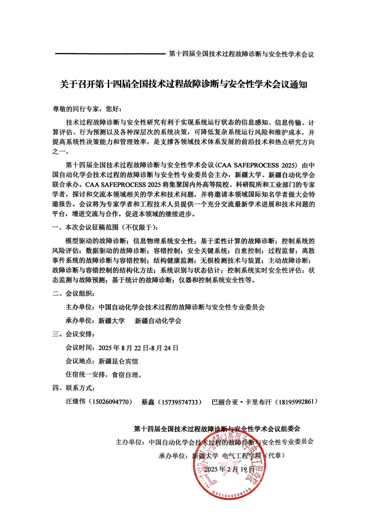 全国技术过程故障诊断与安全性学术会议由中国自动化学会技术过程的故障诊断与安全性专业委员会主办。会议每两年举办一次,旨在为从事相关领域和研究的国内外专家学者和工程技术人员提供一个充分交流最新学术进展和技术问题的平台,增进交流与合作,促进本领域的持续进步。第十四届全国技术过程故障诊断与安全性学术会议(CAA SAFEPROCESS 2025)将于2025年8月22日-24日(周五至周日)召开,地点位于新疆乌鲁木齐市。本次会议由新疆大学、新疆自动化学会联合承办,四川大学、石河子大学、新疆工程007足球