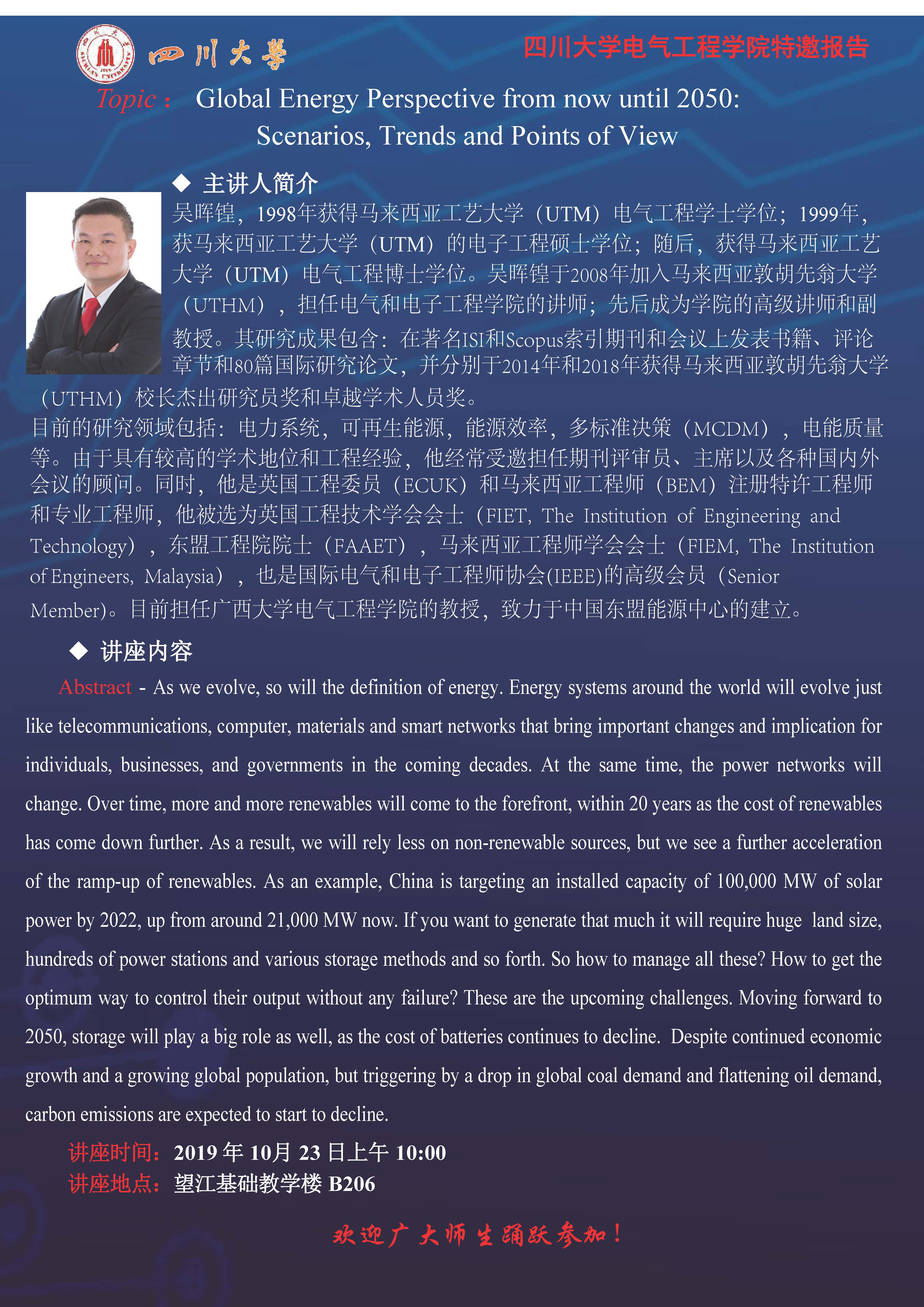 讲座预告:Global Energy Perspective from now until 2050:Scenarios, Trends and Points of View