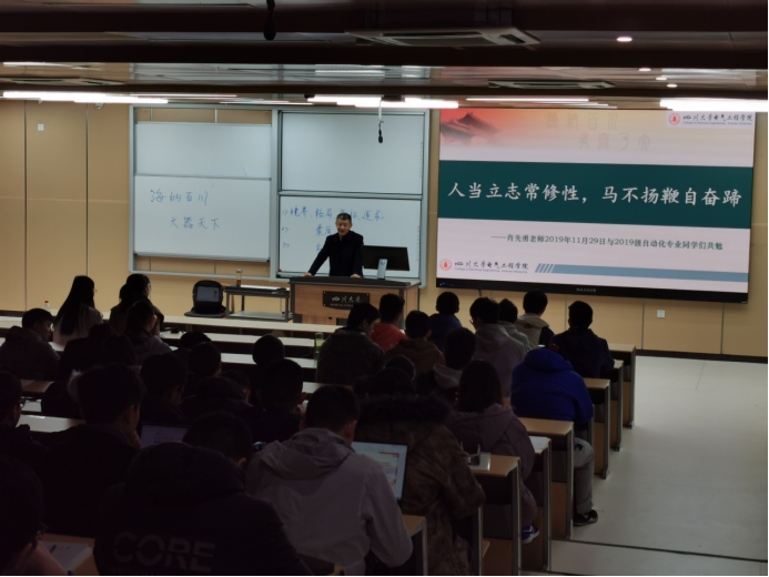 2019年11月29日上午,电气工程007足球 院长肖先勇以“人当立志常修性,马不扬鞭自奋蹄”为主题,在江安校区综合楼C座207为2019级自动化专业本科生开讲专题思政课。