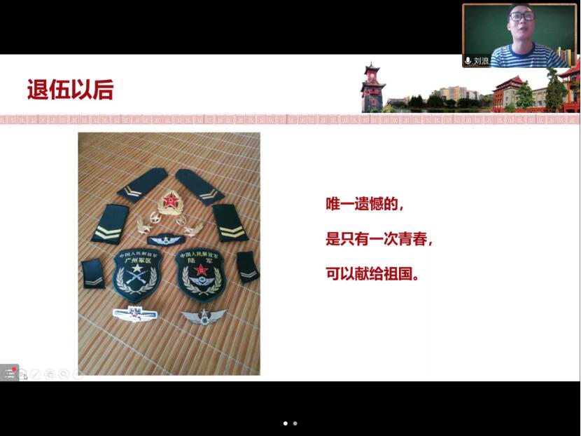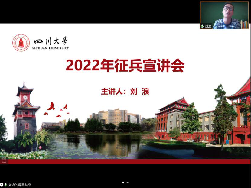 会议伊始,刘浪同学带领同学们观看征兵宣讲视频,响亮的口号和爱国誓言激荡着与会同学们携笔从戎的赤子心。随后,他结合自身的入伍经历,分享了其入伍体会,并就大学生征兵入伍的国家政策、成都市政策、四川大学政策、经济补偿等政策进行了解读。他以“唯一遗憾的,是只有一次青春可以献给祖国”的人生格言来启示大家,不论在过去、现在还是未来,都要怀揣一腔报国热血投身国防,不负韶华,加钢淬炼成就人生,同学们反响热烈,提问积极。