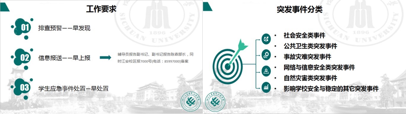 组织全体专兼职辅导员于2020年10月13日在望江校区基教A220举办了学生工作突发事件应急处置培训会,培训会由本科2017级辅导员卢静主讲。