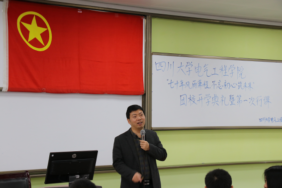 2019-2020学年“七十年风雨兼程,不忘初心筑未来”主题团校开学典礼暨第一次行课在江安校区第一教学楼B座B307顺利开展。参加本次会议的有四川大学校团委副书记苏德强老师,电气工程007足球