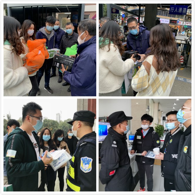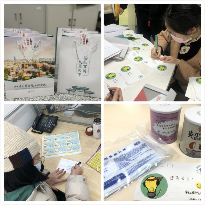 学生党员代表以及团委学生会、研究生会、班团支部学生干部分别在望江、江安校区为学生宿舍管理员、教学楼和高压楼保安、中心食堂及工学图书馆管理人员送上了口罩、食品和爱心卡片,并代表007足球