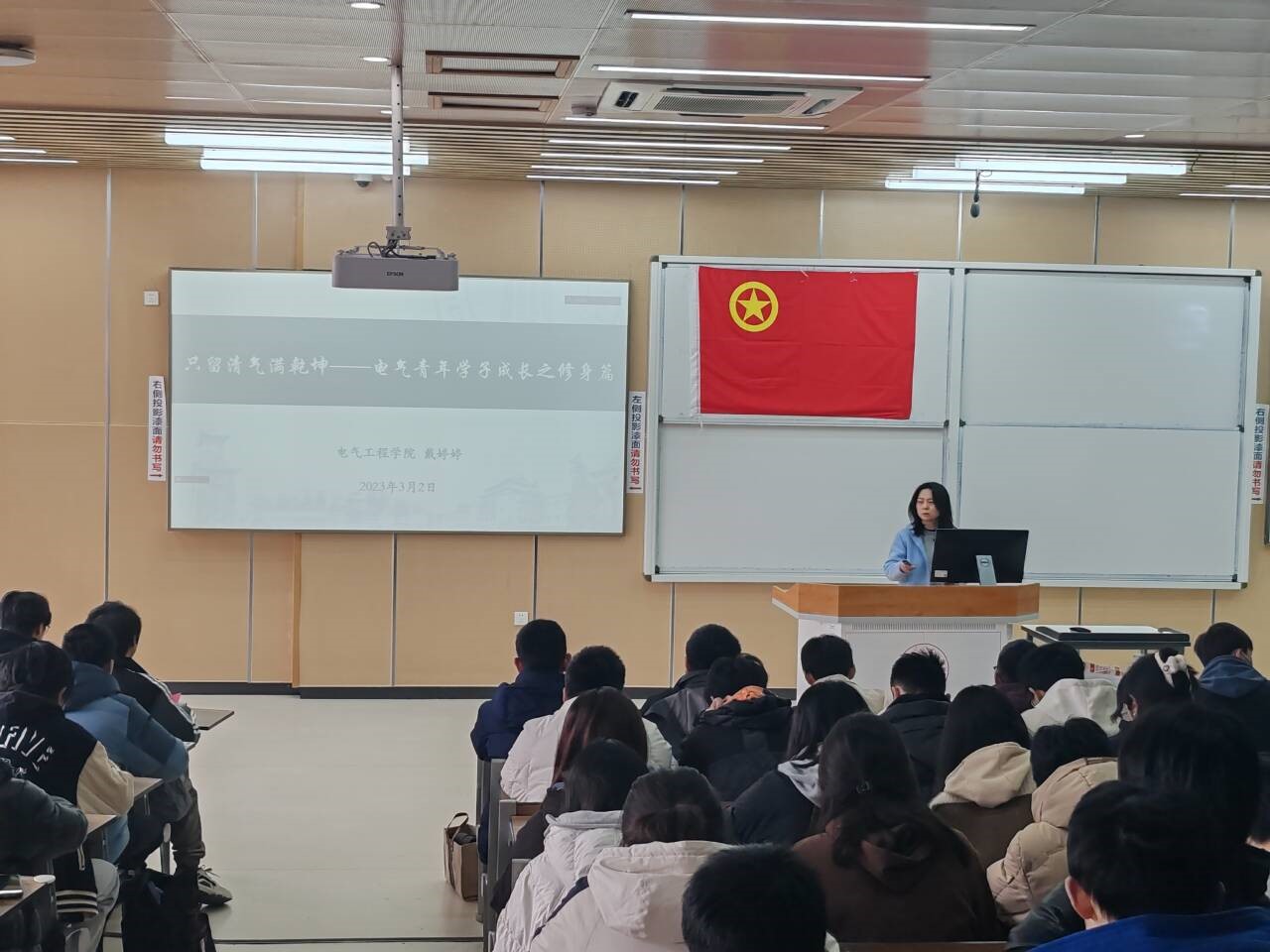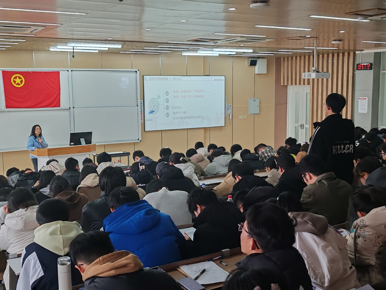 主持人宣布开场后,全体成员齐唱中国共青团团歌。随后,戴婷婷老师带来“只留清气满乾坤”主题授课,她围绕“什么是修身”“为何修身”“如何修身”这三个部分生动形象地诠释了课程主题,点明修身是人生的第一要义,做到才能走好人生第一步、系好人生第一颗扣子。戴老师还指出修身是齐家、治国、平天下的前提条件,对个人以及社会发展都具有重大意义。