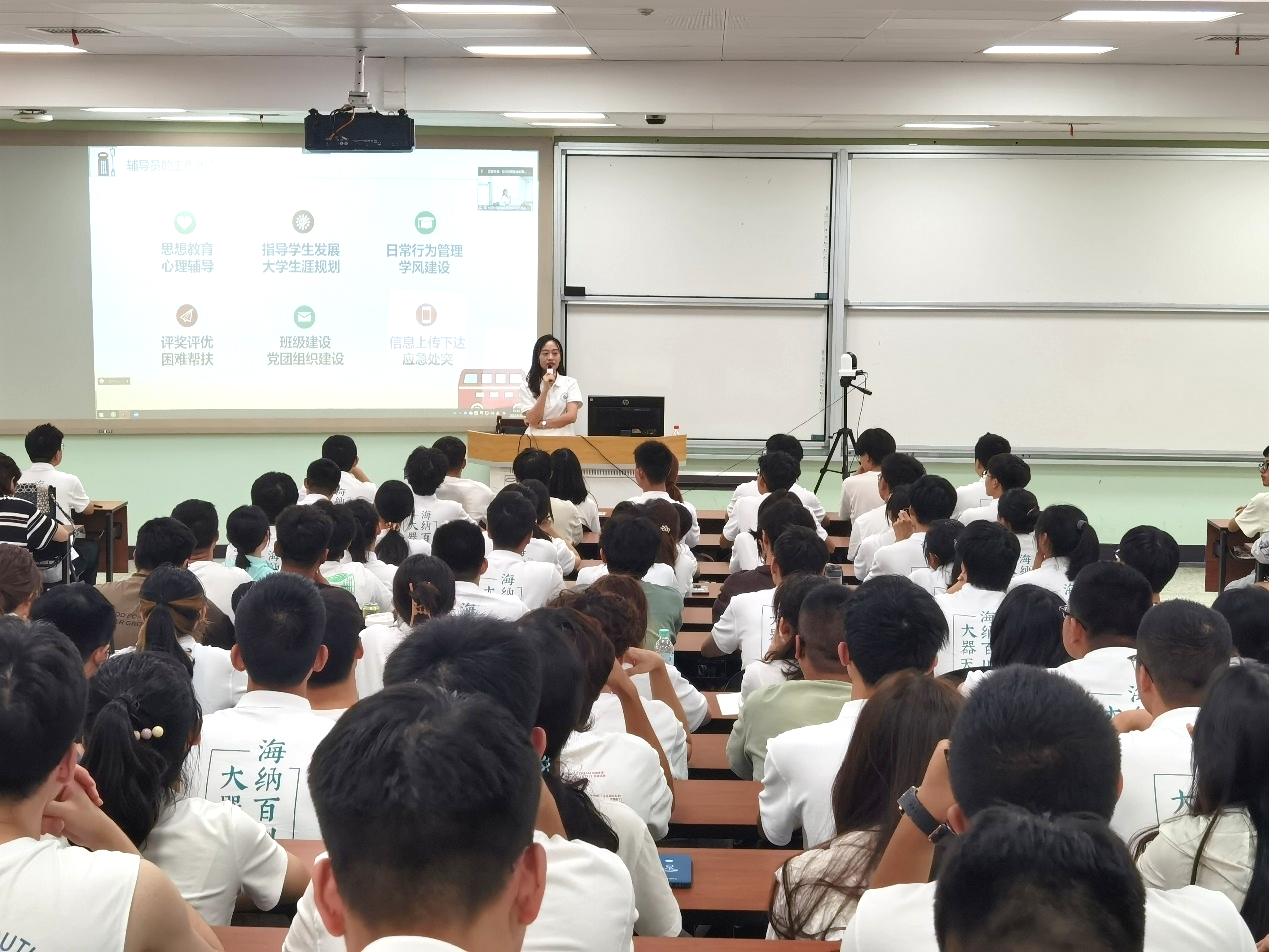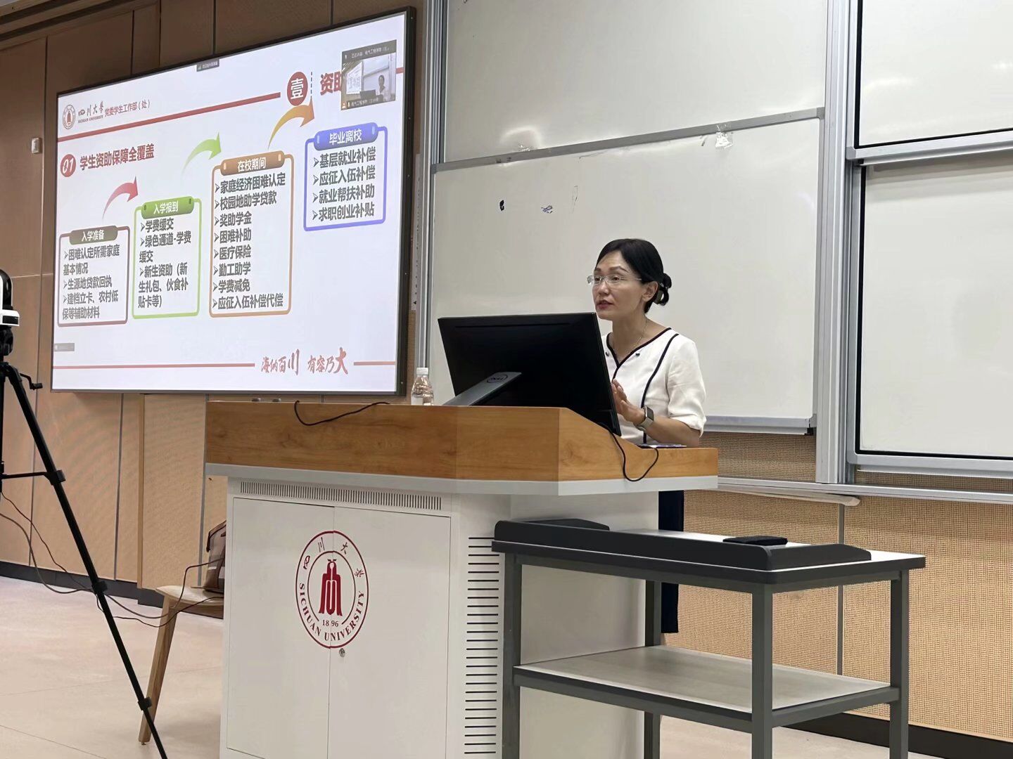 邀请学工部资助中心卓玛老师担任主讲嘉宾,向新生们宣讲学校的资助政策。卓玛老师深入、细致地介绍了由国家、社会和学校共同建立的八位一体资助育人体系,切实全方位为每位川大学子顺利完成学业保驾护航。卓玛老师还介绍了育人政策,包括四个成才计划,三个工作坊,以及“4+3”学生团队,帮助同学们提升综合能力。最后,卓玛老师提醒同学们警惕电信诈骗,远离校园贷款,提高防范意识和自我保护能力。
