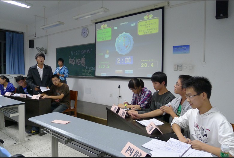 各班派代表参赛。第一场比赛以“是否应该让青少年充分接触社会”为题,正方坚持“应该让青少年充分接触社会”的观点,强调青少年应主动适应复杂的社会,而不是一味躲在象牙塔里;而反方则认为,不应该让青少年过早的接触社会上的黑暗面,影响青少年的健康成长。之后的第二场辩论中,正方认为网络充实了大学生活并举例论证,而反方坚持网络影响人的正常交际,降低了人的幸福感。现场各位辩手成竹在胸,咄咄逼人,双方针锋相对,言语犀利,不时赢得台下掌声。随后,各位评委对同学们的表现进行了总结,指出各场比赛正反方论点上的不足以及细节上的问题并提出了作为大学生应该做什么等值得大学生思考的问题。