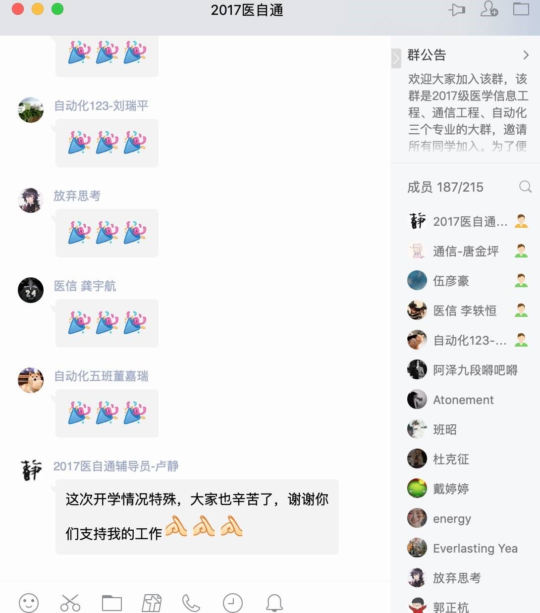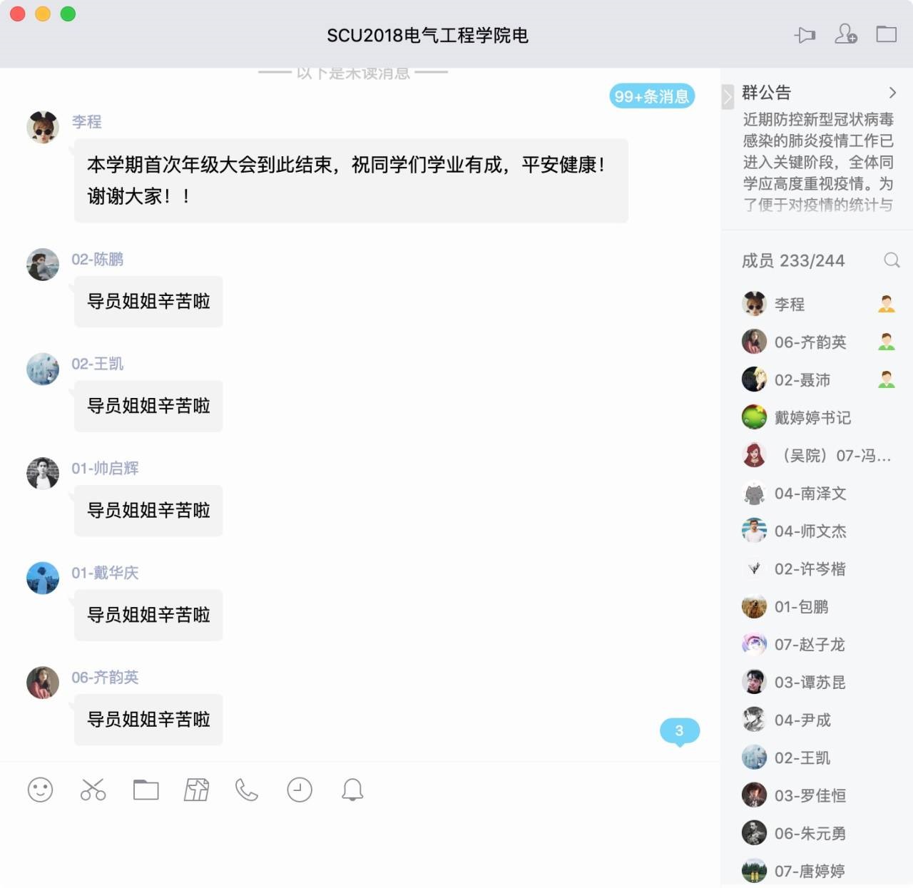 同时,老师们再次强调了学校关于学生管理方面的要求,提醒同学们坚持每天在规定的时间内打卡“四川大学微服务——健康每日报”;要求所有学生耐心等待学校通知,返校时间未确定之前,一律不得提前返校。此外,各位老师还在线为学生答疑,并就各自年级所存在的一些实际情况,提出参考建议。