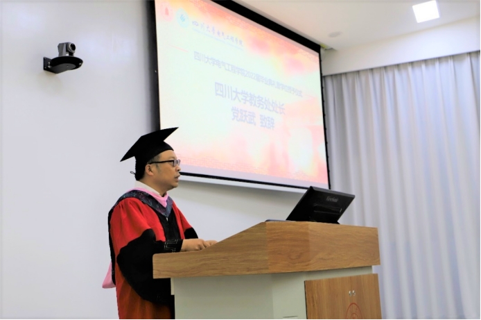 典礼在庄严的国歌声中拉开帷幕。典礼伊始,四川大学教务处处长党跃武教授致辞。党处长引用任鸿隽老校长的三句话寄语毕业生,希望大家要忠于所学,要有所不为,还要继续求学精神。还指出“求利太奢”、“求效太速”、“不能持久”等问题,可作为今日新工科建设的“内省”支持,作为新工科人才培养的“自律”之宝。他真诚祝愿毕业生从四川大学这片“看见信仰所开放的花朵”的沃土启航,“‘电’掣风驰登远程,‘气’清识卓壮心横,‘天’涵地拥百廿润,‘下’自成蹊共凯声”。