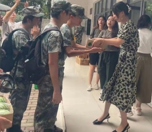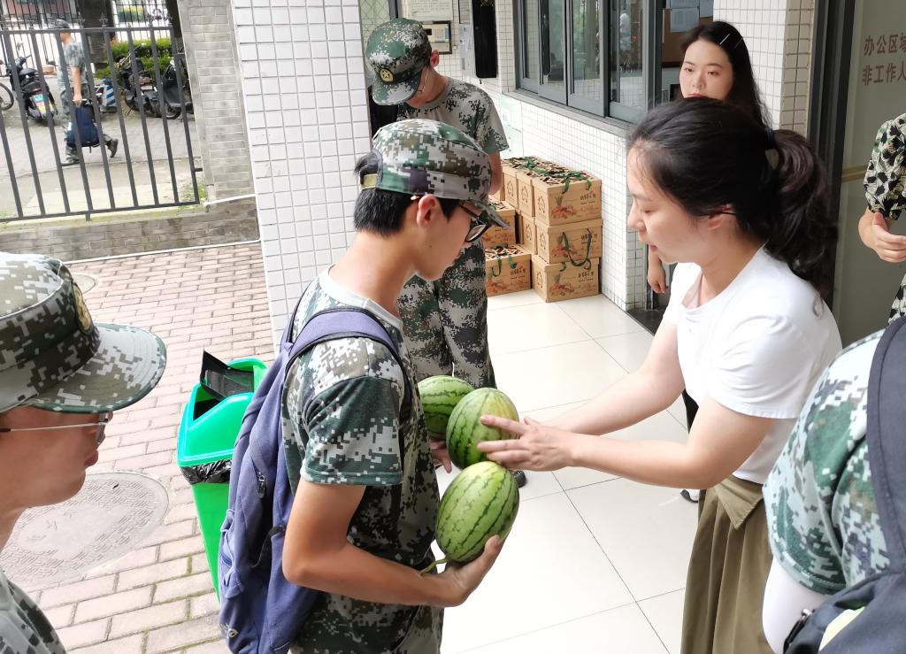 向军训学生表达了关心慰问,赞扬了同学们在军训中表现出的吃苦耐劳精神。接着,老师们为军训学生分发慰问水果,并提醒大家天气炎热要注意身体,鼓励同学们继续发扬不怕苦、不怕累的川大电气人精神。