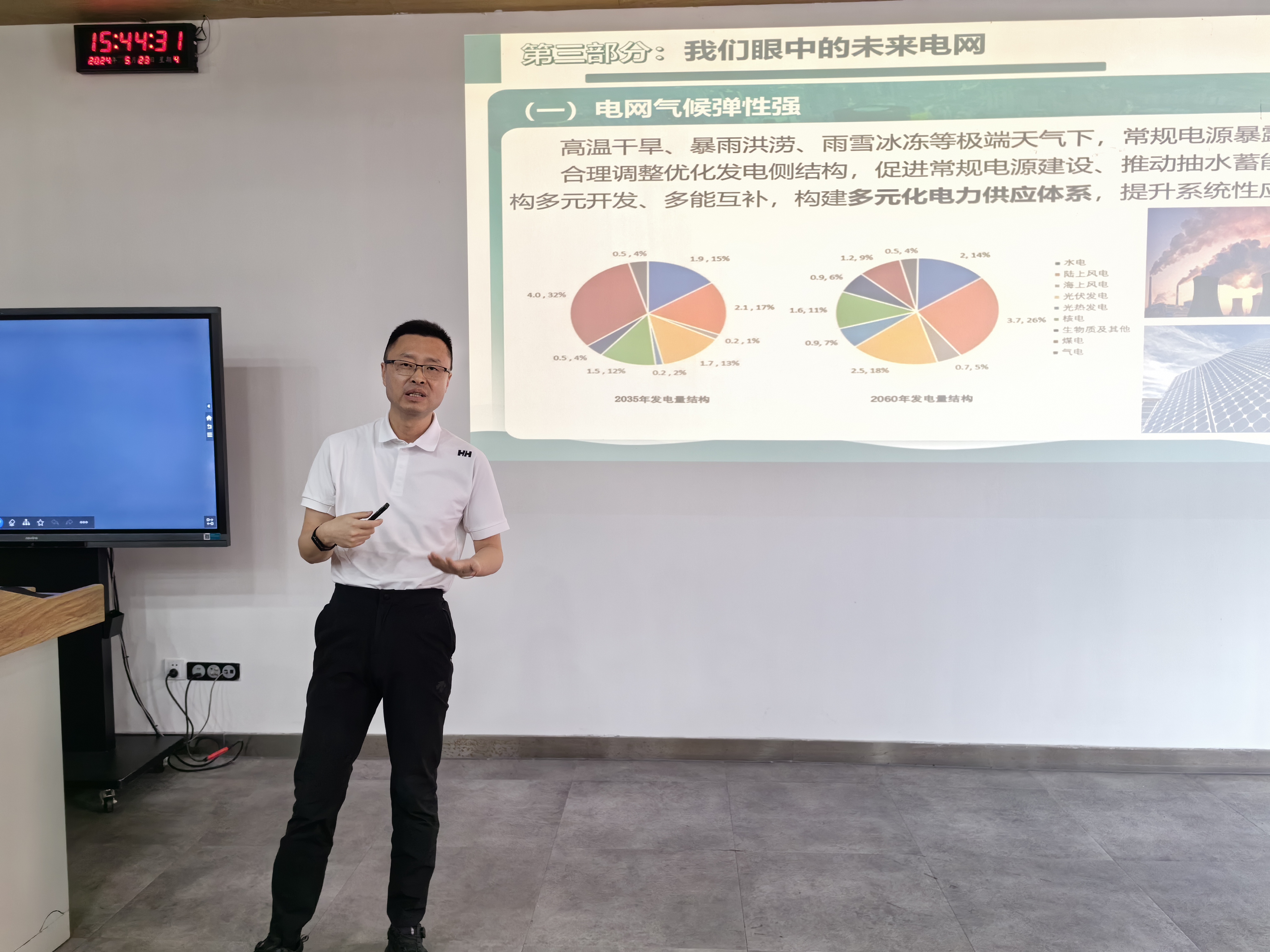 胡翔老师结合课程主要内容为同学们详细讲解了电网调度运行管理日常工作,与电网运行监视、状态估计、安全分析等调度自动化技术的实际应用情况,并从认识电网,管理电网,未来电网三个方面分析了调度管理工作在新型电力系统中面临的挑战和应对的方法。他指出,当西南电网异步运行后,会出现电网灵活性降低,频率安全风险加大,超低频振荡风险加剧等问题,并提出了风险应对措施与防御体系。胡老师根据多年从业经验总结出,解决任何工程问题都需要未雨绸缪,开展特性认知,预知安全风险,做好预案管理。