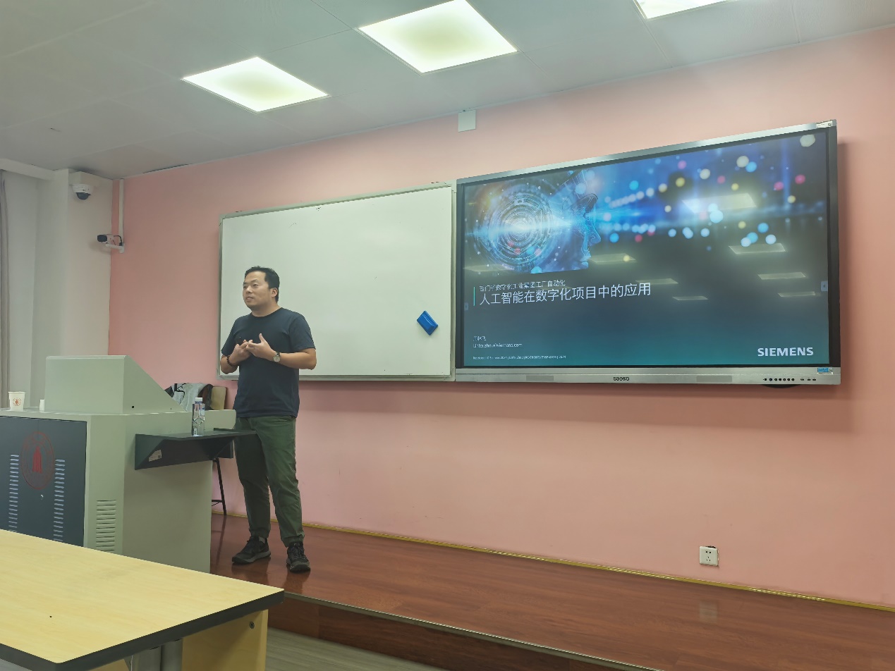 讲座上,周林飞博士深入浅出地介绍了四部分内容:什么是人工智能?什么是工业人工智能什么是数字化?工业4.0下的智能制造数字化底座。讲座过程中,周博士向同学们展示了人工智能的简单案例、西门子工业4.0智能化工厂建设实例、工业人工智能应用落地案例等。