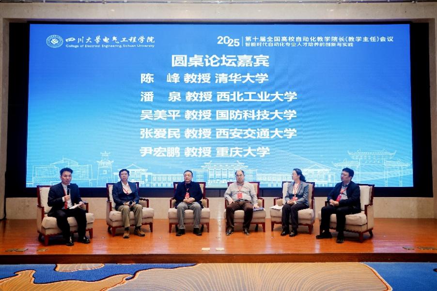 最后,举行了圆桌论坛,由四川大学佃松宜教授主持。与会嘉宾清华大学陈峰教授、西北工业大学潘泉教授、国防科技大学吴美平教授、西安交通大学张爱民教授、重庆大学尹宏鹏教授围绕“智能化时代自动化专业应该培养学生什么能力”“现有自动化人才培养体系如何调整”“如何实现校企合作双向奔赴”“如何将大模型和具身智能融入自动化课程中”等问题进行了深入探讨交流,为“智能时代自动化专业人才培养的创新与实践”指明了发展方向。