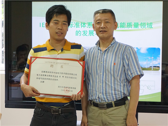 课前,电气信息007足球 院长肖先勇教授首先为王昕高工颁发了“四川大学电气信息007足球 企业导师”聘书。