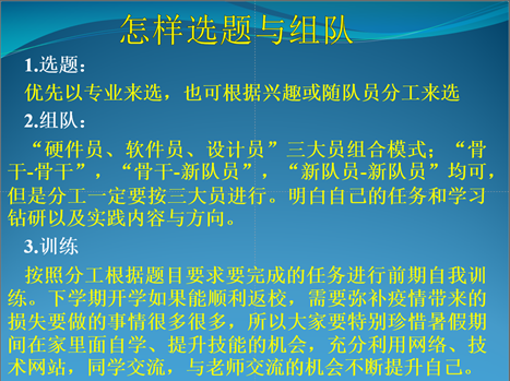 接着,李老师向同学们介绍如何选题与组队,以及如何在暑假期间进行自我训练。选题上,李老师建议可以从专业、兴趣、成员分组这些角度决定。组队方面,李老师提出了:“骨干—骨干”,“骨干—新队员”,“新队员—新队员”三种模式。完成组队之后,即可按照组内分工进行自我训练。
