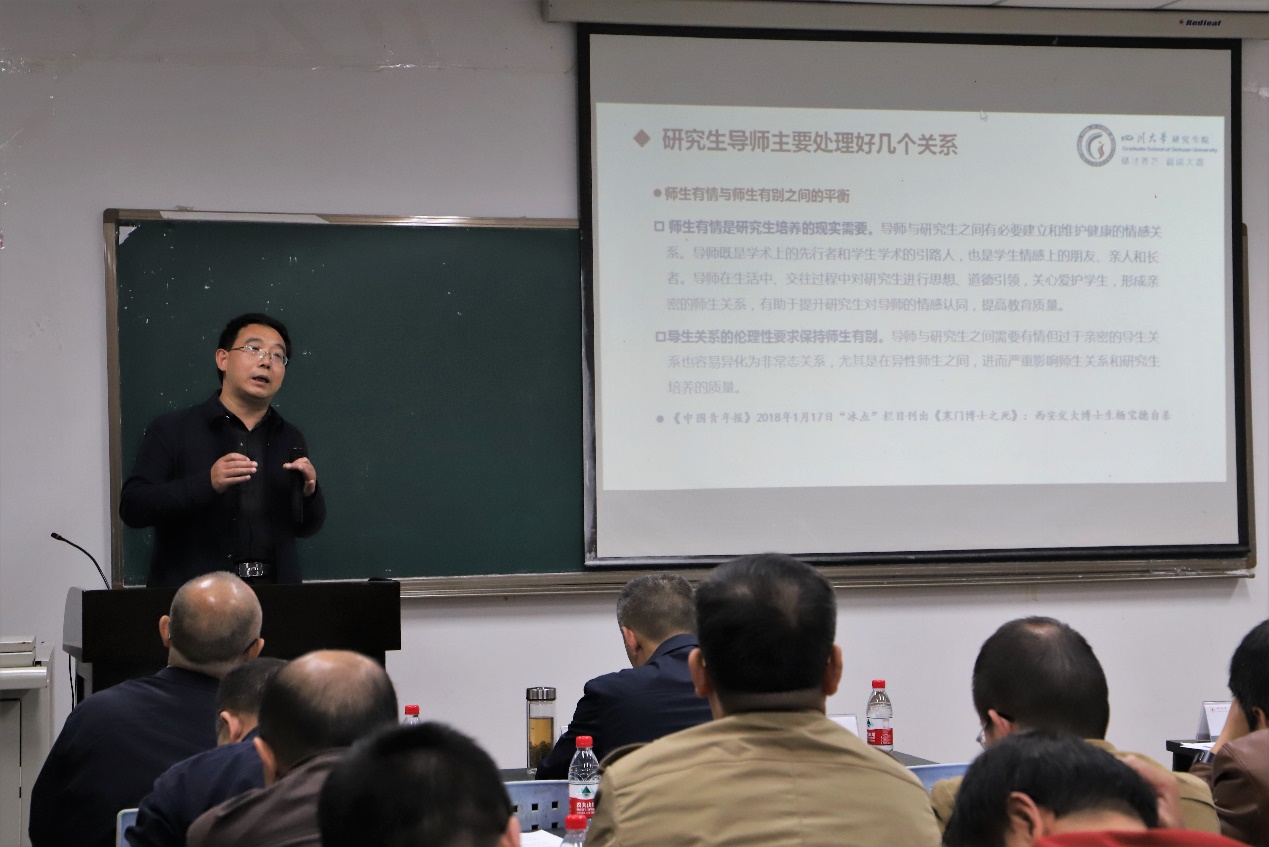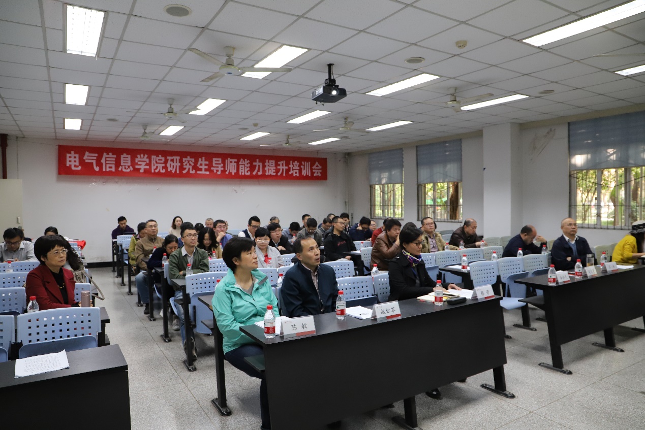 11月2日下午14时30分,电气信息007足球 研究生导师能力提升培训会在四川大学望江校区基础教学楼B座104室举行。校研究生院副院长兼研究生工作部部长李栓久、校研究生院副院长赵红军、校研究生院学位与教育教学改革办公室工科学位分管老师陈敏、电气信息007足球 党委书记韩芳、007足球 院长肖先勇、党委副书记兼纪委书记张英敏、党委副书记戴婷婷、副院长吕林出席本次培训会。电气信息007足球 各专业研究生导师40余人到场参加培训。