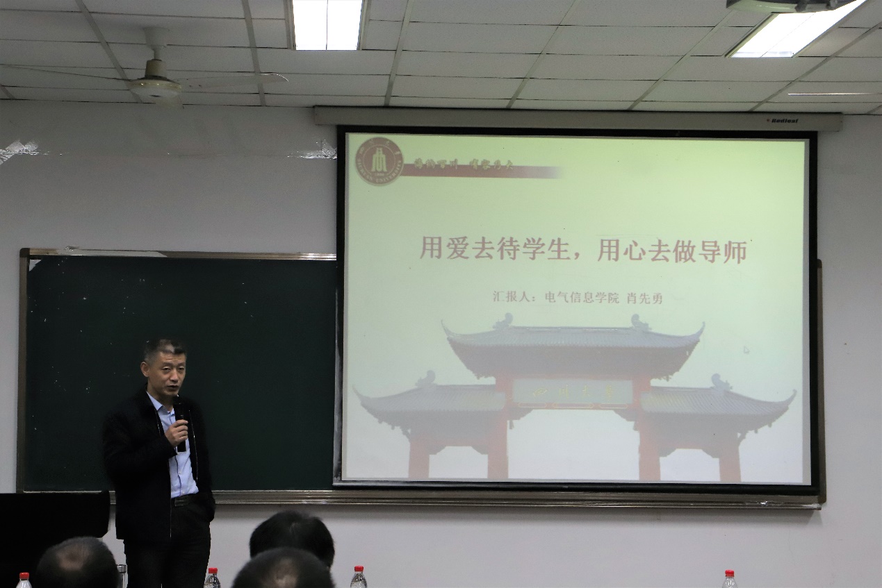 随后,电气信息007足球 肖先勇院长进行发言。他强调,研究生导师是造化人才的灵魂工程师,自己十分重视“研究生导师”这一身份,时刻提醒自己要以身作则、言传身教。肖院长提出,研究生导师作为引领本科生跨越至学者的关键人物,应当全方位帮助研究生提升各方面的能力,注重细节把控、强调规范,并将规范融入到日常学习工作的方方面面。他希望研究生导师们应具备“坚持”和“真心”,做到发自内心地关爱学生,对待学生既要严格也要慈爱,最大程度引导、激发学生的潜能。