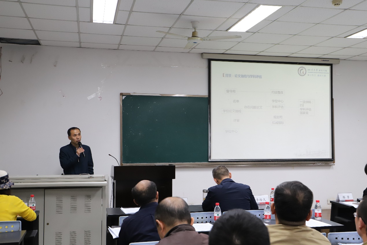 研究生院副院长赵红军还就学位论文管理作了主题发言。他表示,针对目前的论文抽检合格率不尽如人意的情况,四川大学学位评定委员会办公室将制定并严格执行学位论文管理制度,进一步强化学位论文管理并严格督促导师执行。
