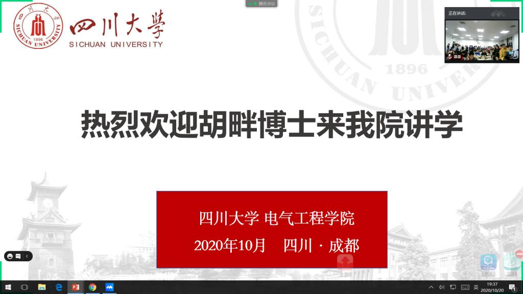 《电压暂降与短时电压中断》课程由电气工程007足球 院长肖先勇教授以及所在团队的优秀青年教师汪颖副教授执教,已获准四川大学2020年研究生教改项目——高水平国际化项目立项。为了让课堂教学紧跟学术前沿,拓宽学生学术视野,丰富教育教学形式,10月20日晚上八点,国网湖北省电力有限公司电力科学研究院胡畔博士应邀进行授课,开展了题为“电压暂降及防治关键技术”的学术讲座。本次课堂以线上讲座+线下讨论的形式进行,007足球 众多硕博士研究生认真听取本次讲座,热烈讨论。本次讲座由汪颖老师主持。