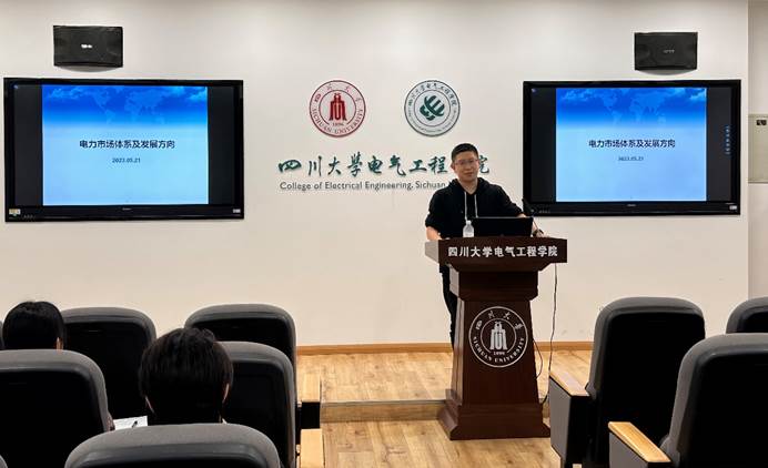 2023年5月21日下午,四川电力交易中心研究策划部陈礼频主任应邀在四川大学基础教学楼B座206开展题为“电力市场体系及发展方向”的学术讲座。讲座由郑子萱老师主持,电气工程系师生30余人参加了讲座。