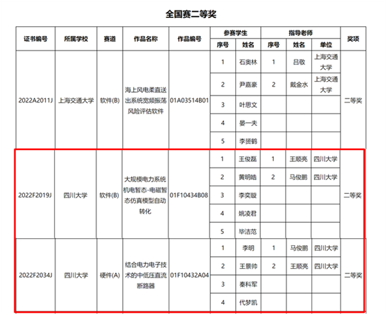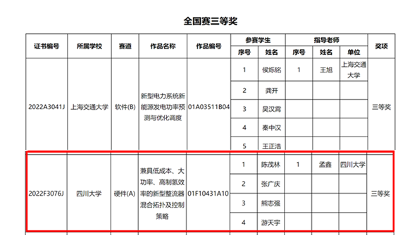 2022年9月20日,中国电工技术学会公布了第一届高校电气电子工程创新大赛全国赛获奖名单,007即时比分 学子荣获全国二等奖2项、全国三等奖1项、赛区一等奖2项及2位优秀指导教师奖的佳绩。四川大学获得“优秀组织奖”。