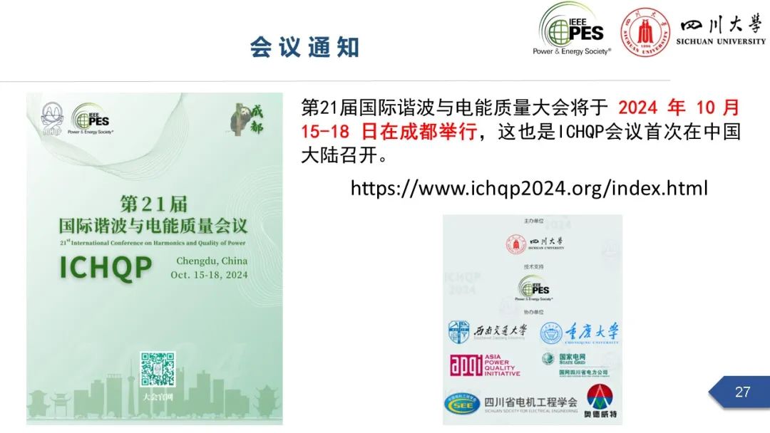 电能质量与优质供电团队,始建于1970年代,是我国最早的电能质量团队之一,是四川大学“创新2035”五大先导计划、“双一流”超前部署学科的重要支撑团队。团队依托智能电网四川省重点实验室、电能质量与电磁环境学省级重点实验室,肖先勇教授、杨洪耕教授、徐文远教授(四川大学高端外籍教师,每年在川大工作3月)为团队学术带头人。近几年,团队承担国家重点研发计划、国家自然科学基金(重点、面上、青年)、省部级和国网、南网等项目60多项,年科研经费2000多万元,发表SCI论文120余篇,授权专利62项,编制国际标准、国家标准、行业标准共12项。获省部级奖9项,其中四川、江苏省科技进步奖一等奖各1次,中国电力创新奖一等奖1次,中国专利奖优秀奖1次。成果应用在全国21个省级电网,包括北京冬奥会、成都世乒赛、成都大运会等重大活动,西电东送、清洁能源消纳、卫星发射等国家重大工程。获电能质量领域最有影响力的IEEE ICHQP 2024年主办权,该会议首次在中国大陆举办。