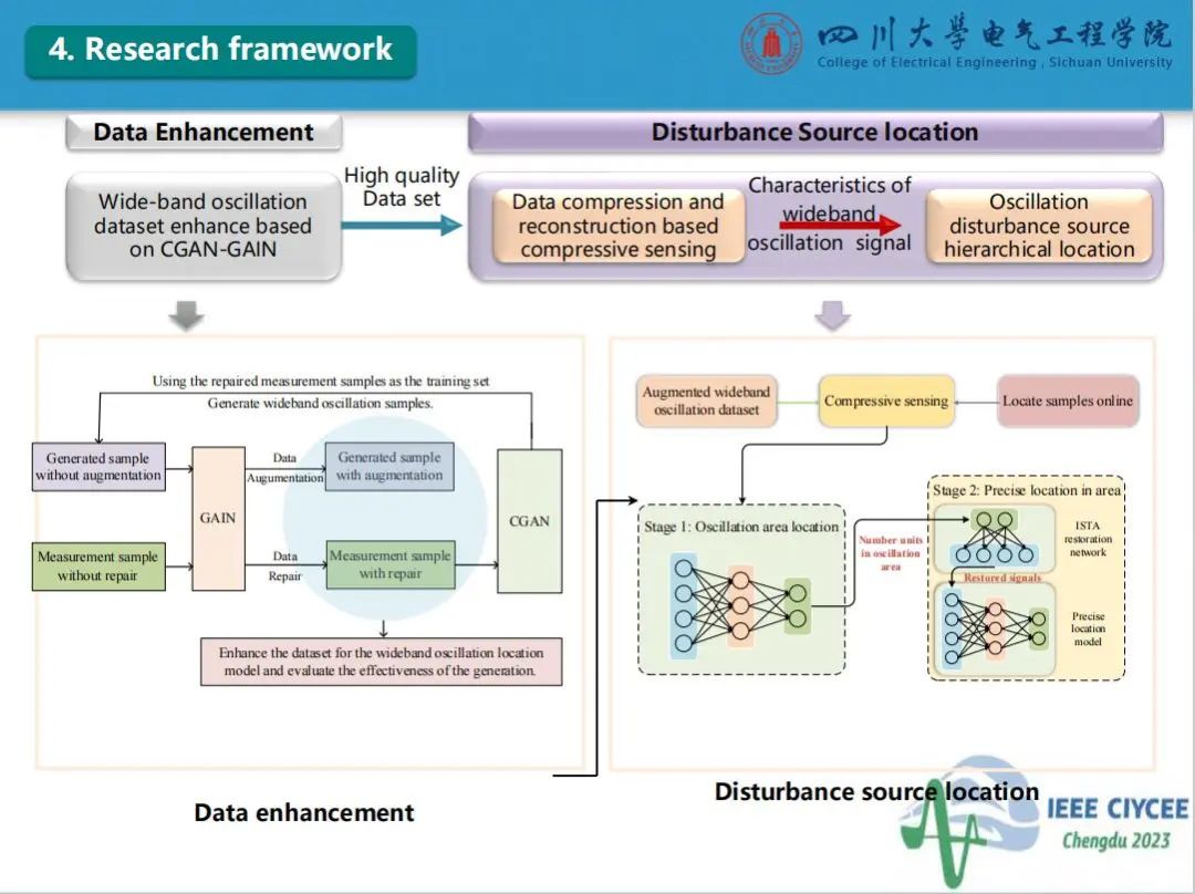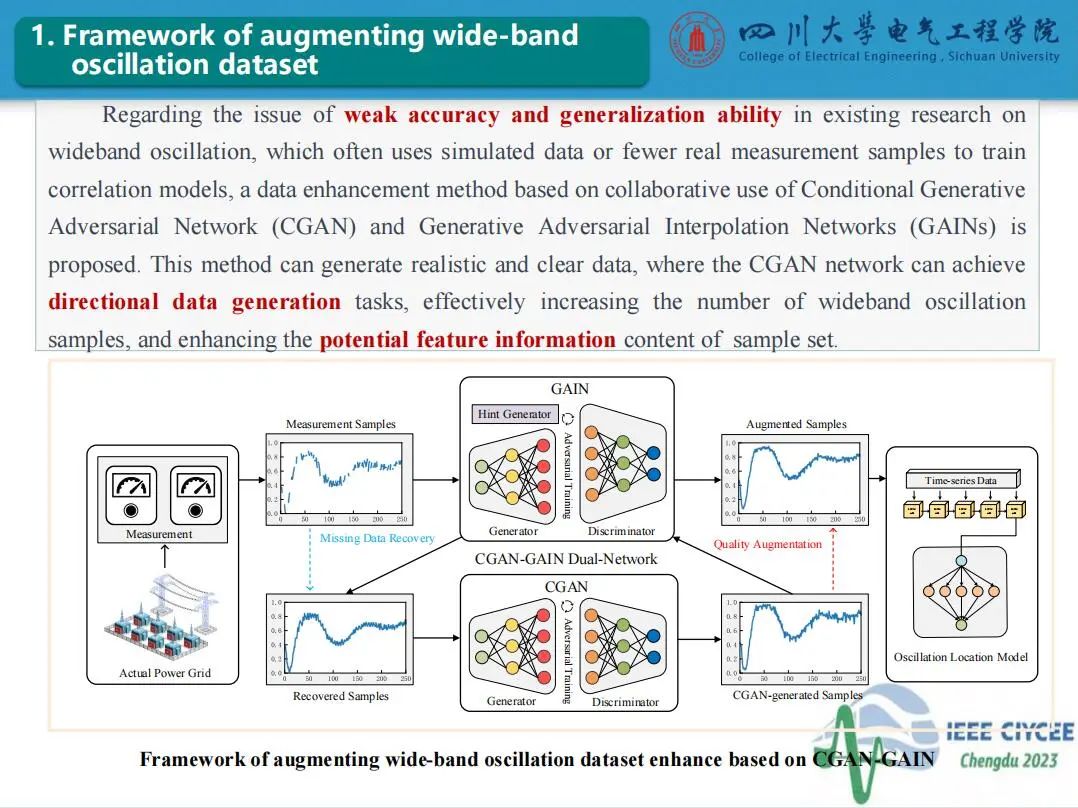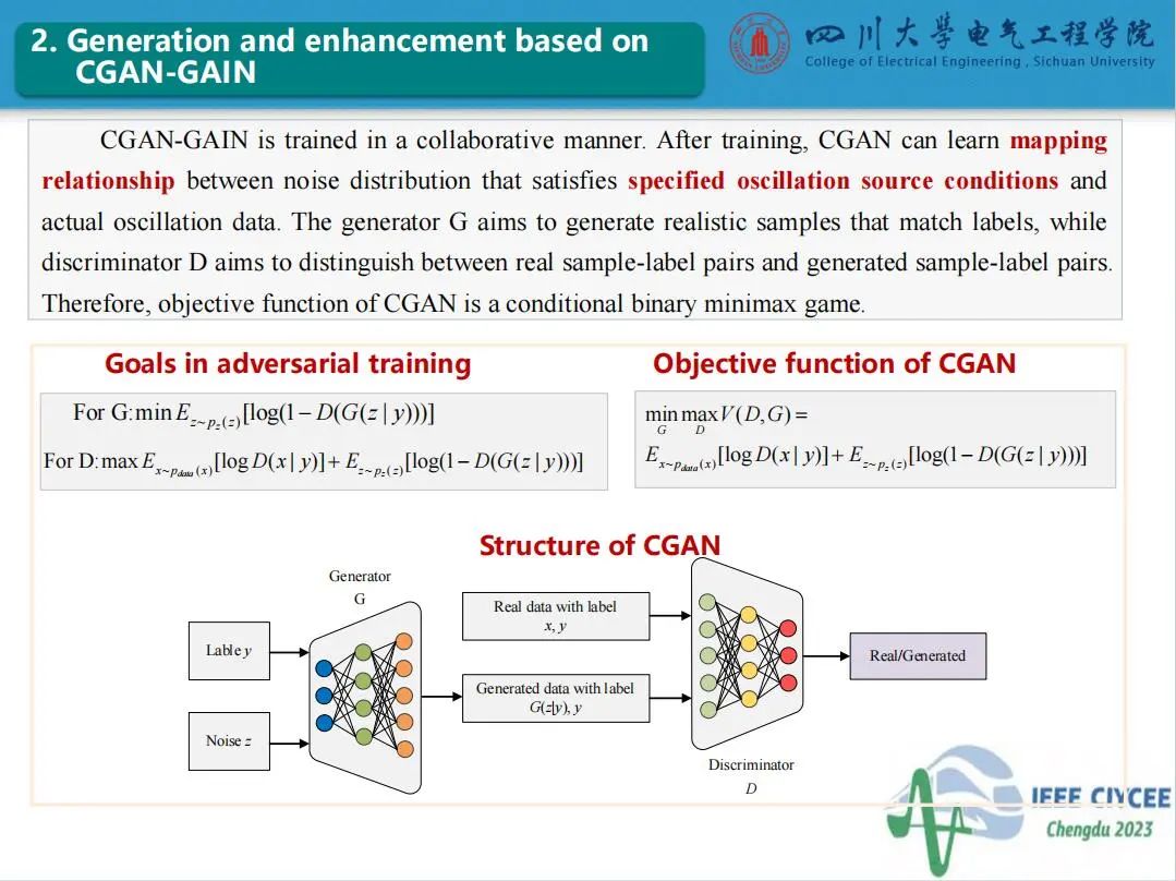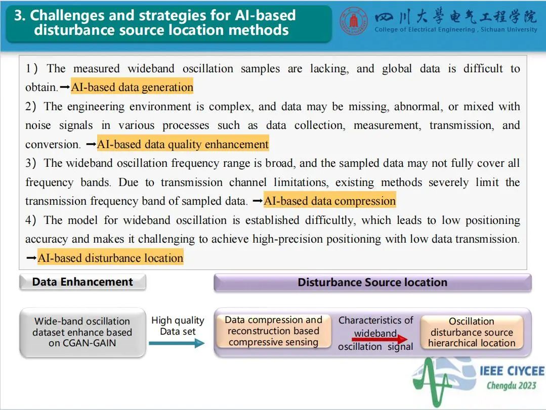 特聘副研究员郑宗生作了题为“电力系统宽频振荡扰动源定位智能增强技术”的主旨报告,介绍了目前电力系统宽频振荡扰动源定位面临的问题及人工智能技术应用于振荡源定位的挑战,分享了团队在基于条件生成对抗网络和生成对抗插补网络的数据智能增强方法和基于压缩感知与软阈值迭代算法的电力系统宽频振荡扰动源分级定位方法的研究工作。经本人授权,与大家分享报告PPT。