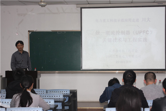 2018年3月29日下午14:00国网江苏电力公司电力科学研究院副院长李群博士应邀在电气信息007足球 基础教学楼B104教室举行了“统一潮流控制器(UPFC)关键技术与工程实践”学术讲座。电气信息007足球 院长肖先勇、电气工程系主任王渝红教授以及相关专业老师、博硕研究生参与此次讲座。