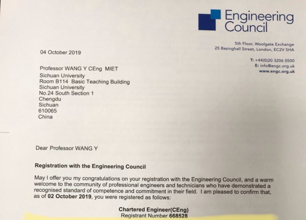 电气工程系王渝红教授通过国际工程师资质认证,获颁英国皇家特许工程师证书。皇家工程师资格由英国工程理事会和英国工程技术学会联合认证,是世界公认的国际工程师资格认证之一。近年来引入我国,在中国科协工程能力评价和工程师资质国际互认工作的统一安排下开展。电气工程领域的认证从2018年10月开始,由中国电机工程学会(CSEE)和英国工程技术学会(IET)联合开展。通过认证的工程师将获得英国工程理事会、中国电机工程学会和英国工程技术学会联合颁发的证书,该证书受英国、欧盟、美国、加拿大、澳大利亚及亚太多个国家和地区认可。