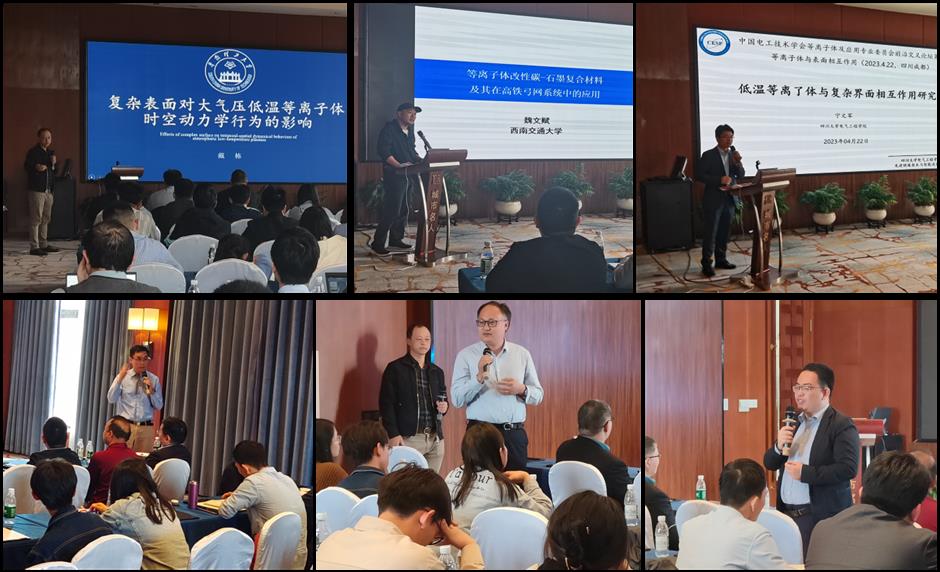 电工研究所窦立广副研究员等专家学者,分别针对“高速铁路弓网受流技术”、“复杂表面对大气压低温等离子体时空动力学行为的影响”、“等离子体改性碳石墨复合材料”、“低温等离子体协同催化能源环境应用研究”、“气体侧放电下固体绝缘表面积聚电荷类型研究”、“低温等离子体与复杂界面相互作用研究”、“气液两相脉冲放电的界面效应及其制备碳量子点的应用探索”、“旋转风机雷击接闪机理及接闪失效机制研究”、“等离子体-界面协同活化C1分子利用及反应机制研究”等主题进行了报告。每一个主题报告结束后,都穿插了专业问答环节,会场的气氛非常活跃。