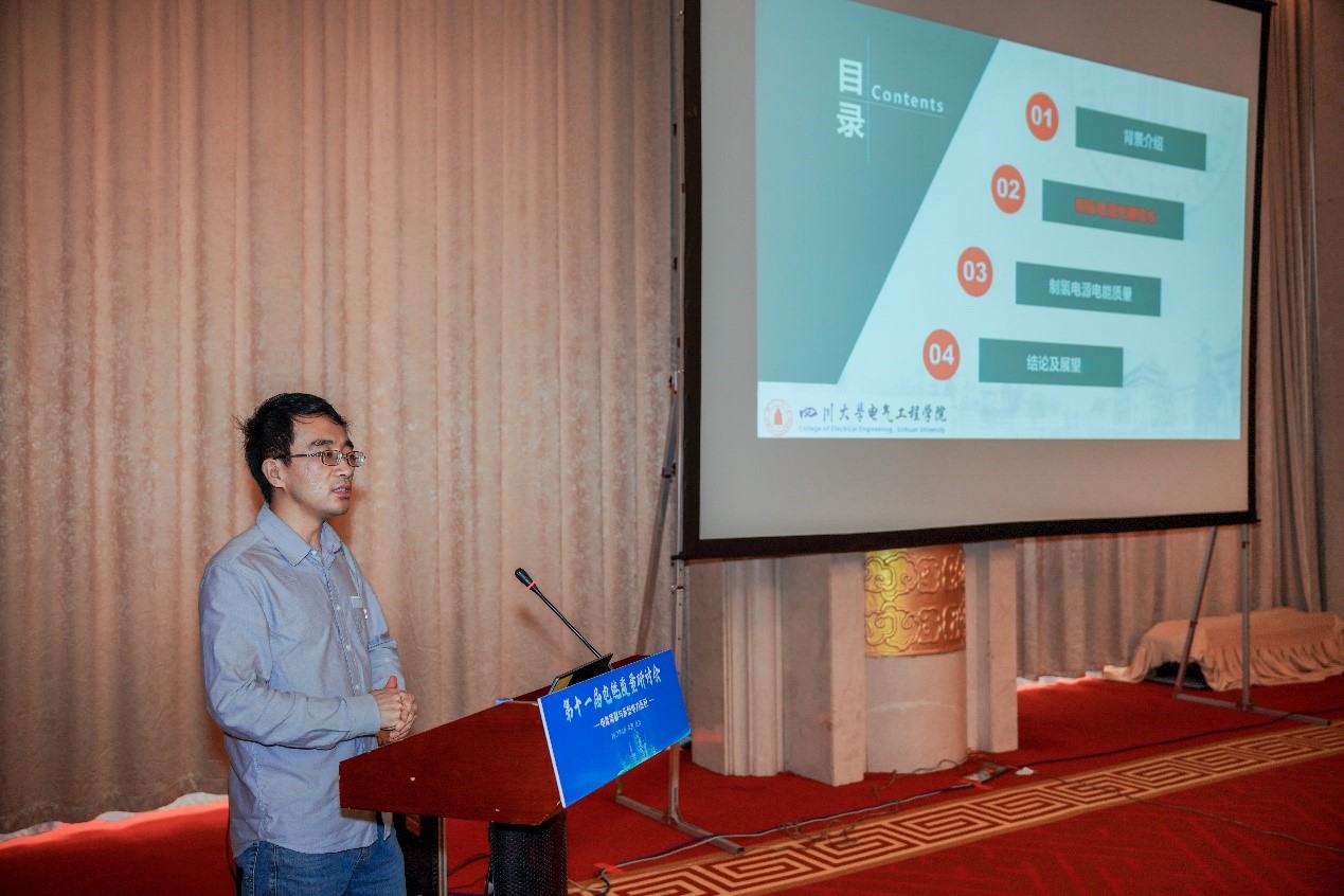 孟鑫副研究员以新能源制绿氢的电源关键技术及电能质量问题为主题作分会场报告,分享了四川大学电力电子团队前期的规模化制氢项目经验,与在场多位专家进行深入探讨交流,获得热烈反响。