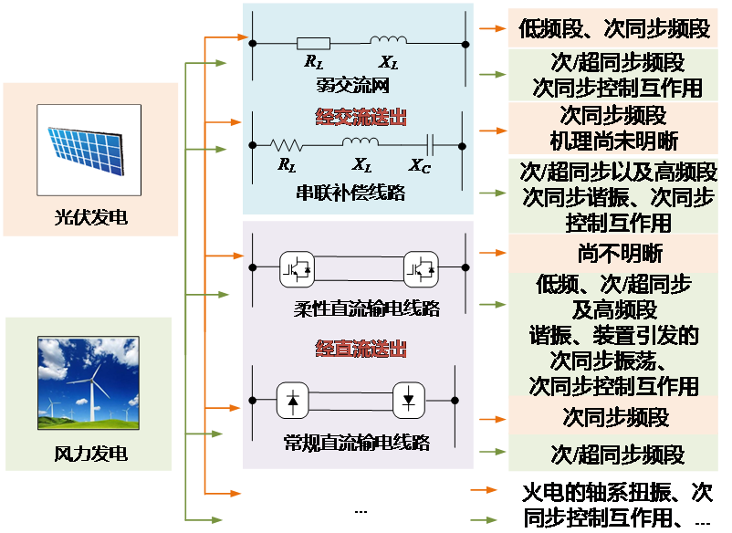 新能源接入引发的宽频振荡可从场景上分为:新能源接入传统交流电网引发和新能源经直流送出引发,不同的送出方式分类如图4所示。文中介绍并归纳了不同类型、不同场景下宽频振荡的产生机理及主导因素。