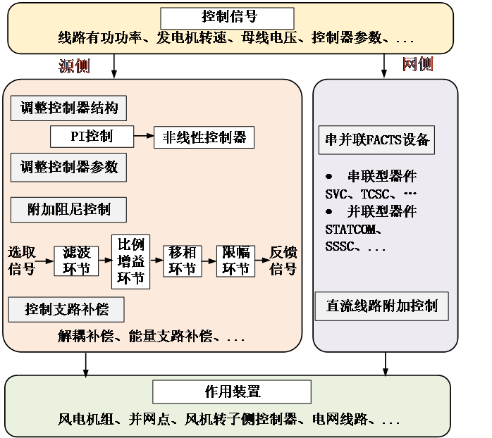 现有的宽频振荡抑制策略可从控制对象上分为源侧和网侧,如图6所示,源侧的抑制策略包括调整发电机组参数及控制结构,附加阻尼控制及支路补偿,源侧进行振荡抑制可以直接提取相关电气量,且靠近目标机组进行控制效果更优。网侧则依托串并联柔性交流输电系统及直流线路附加控制,网侧可以直观地针对易引发振荡的线路进行谐振消除和保护。