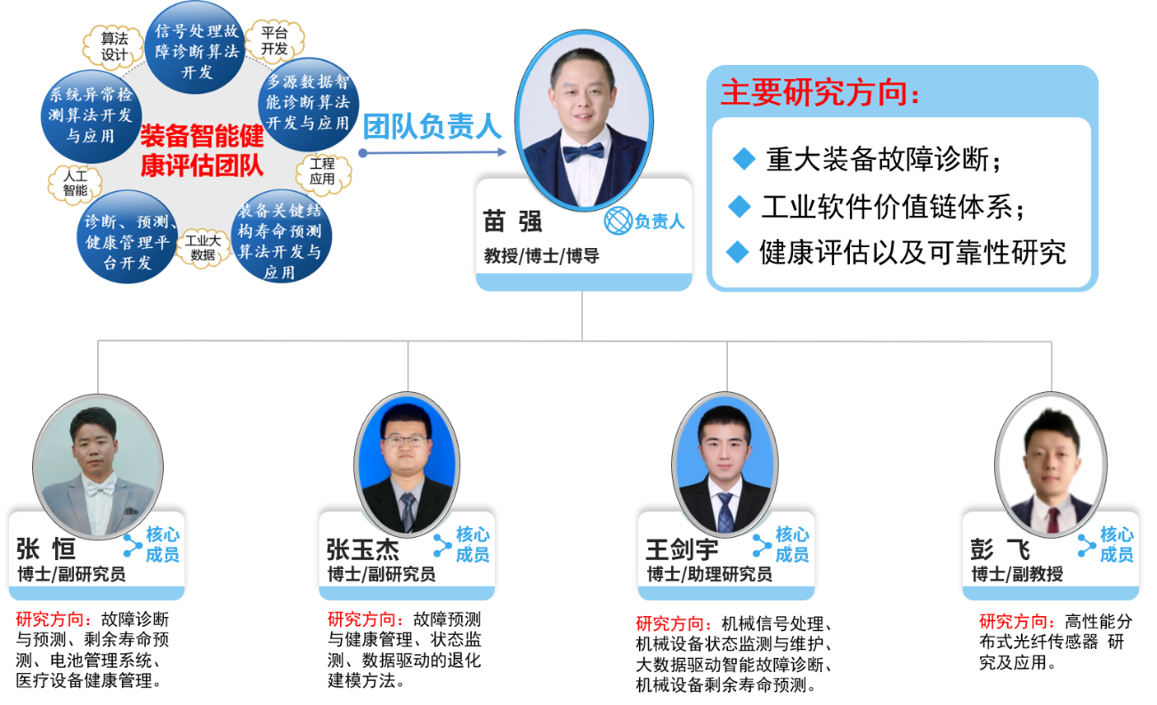 “装备智能健康评估”团队依托于四川省空天信息与智能装备国际科技合作基地。在团队负责人苗强教授的带领下,面向能源动力等装备安全可靠运行的重大需求,围绕健康状态先进感知与测试、异常检测与诊断、健康评估与预测等关键技术开展研究,在所属领域具有独有的影响力。目前,团队已承担了包括国家重点研发计划项目、国家自然科学基金、预先研究及快速支持项目、教育部新世纪优秀人才支持计划等在内的70余项国家级/省部级基金项目和企业横向课题,与二十余所科研院所、大型企业和国内外知名高校建立了紧密的合作与交流关系。在智能制造和工业互联网为代表的工业强国建设目标的指引下,团队以智能信息感知和处理为核心,通过准确感知、互联传输、智能计算和精确控制构建的智能自动化体系,为高端装备的安全运行维护提供自主可控的基础技术支撑。