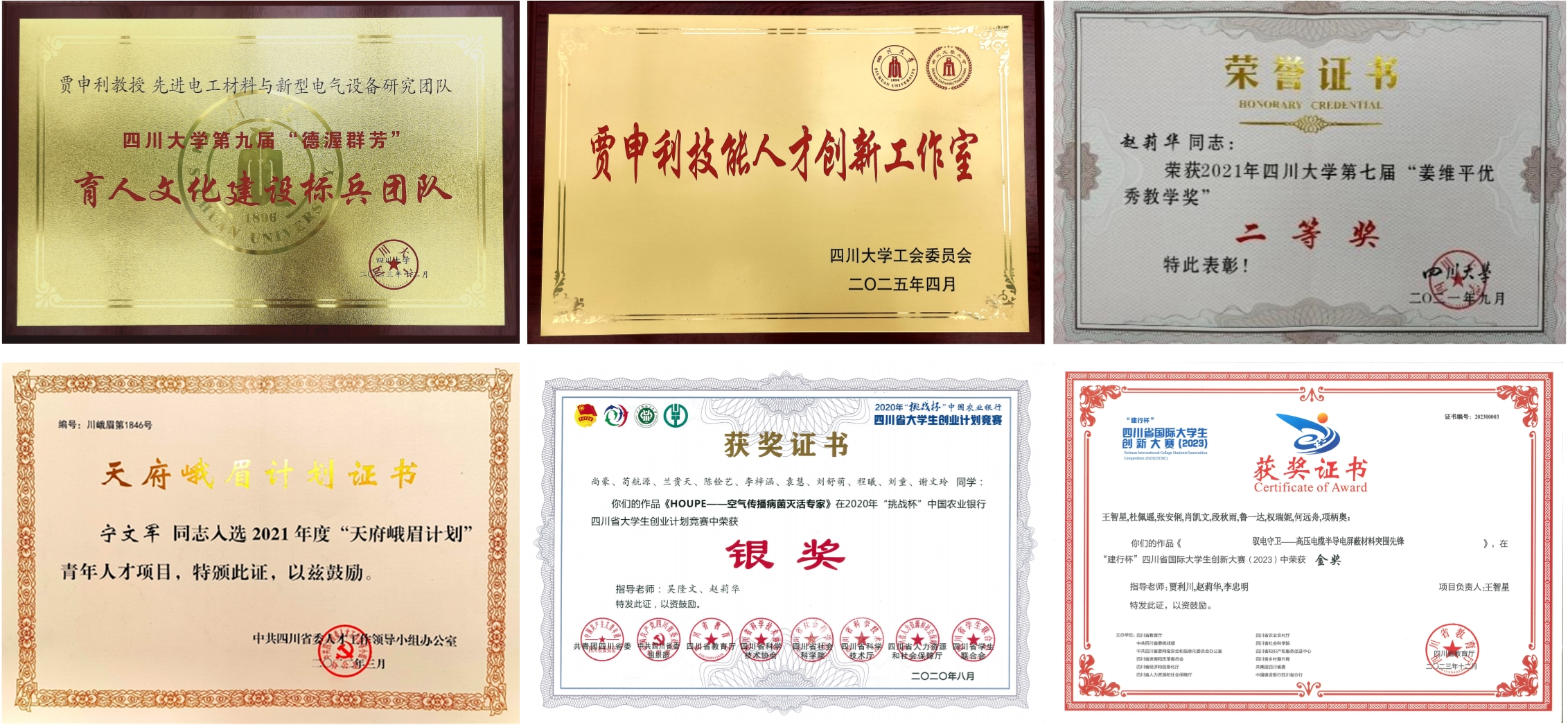 团队在育人实践与科研创新方面成果丰硕,荣获四川大学第九届“德渥群芳”育人文化建设标兵科研团队称号。团队导师在国家级及省部级人才计划、科学技术奖和教学表彰中表现突出。团队学生多人次获得国家奖学金、学业奖学金,以及宝钢奖学金、华为奖学金、长江电力奖学金等各类社会奖学金;同时,多人次获省、校级优秀毕业生、优秀研究生、优秀学生干部、优秀论文和优秀毕业论文等荣誉。在“互联网+”、“挑战杯”、高校电气电子工程创新大赛以及等离子体科技创新竞赛等高水平赛事中,团队连年斩获佳绩,成果显著,彰显出持续的创新活力。