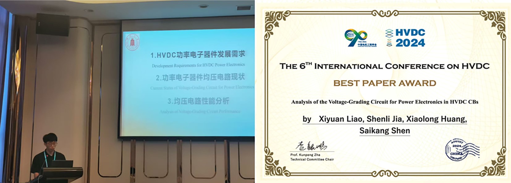 2. 2024年8月8日至10日,第六届国际高压直流会议(HVDC2024)于新疆乌鲁木齐举行,会议由中国电机工程学会联合CIGRE中国国家委员会、CIGRE韩国国家委员会主办。会议旨在交流和探讨高压直流输电、柔性直流输电、直流电网等领域最新研究成果,以推进高压直流技术在世界范围内的研究和应用。先进电工材料与新型电气设备研究团队唐强老师、研究生廖夕源、杨晨曦受邀参会并获得最佳论文奖。