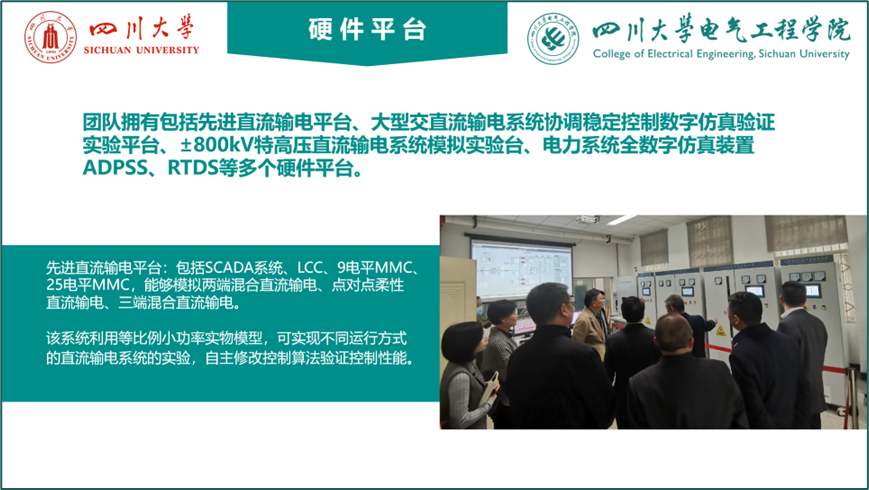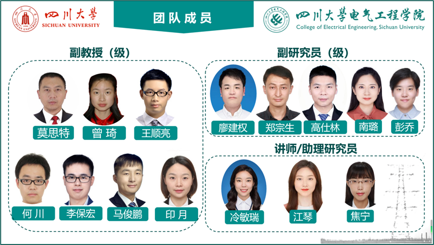 四川大学电力系统稳定与高压直流输电团队,是我国最早从事直流输电相关研究的团队之一,创始人为李兴源教授,现任负责人为博士生导师刘天琪教授*,成员包括王海风教授*、王渝红教授*、杜文娟教授*、张英敏教授*、莫思特*、曾琦*、王顺亮*、何川*、马俊鹏*、李保宏*、印月*、南璐*、彭乔*、郑宗生*、廖建权*、高仕林*、江琴*、冷敏瑞、焦宁。团队有教授5人,副教授/副研究员12人,讲师/助理研究员3人,博导6人,硕导12人。此外,团队拥有汤广福(中国工程院院士)、吴磊(Stevens Institute of Technology 副教授)、贺之渊等高端学术顾问和外聘博导。