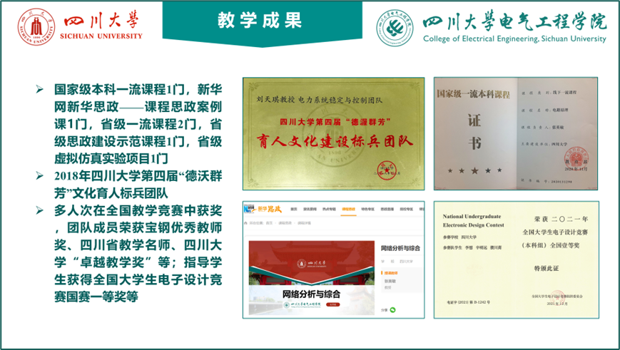团队五育融合,立德树人。把健康人格和高尚品德放在首位,营造有社会责任感、理想信念和探索精神的团队氛围,荣获四川大学第四届“德沃群芳”育人文化建设标兵团队;秉持以生为本教育理念,崇尚科学,追求真理,培养学生独立思考、发现和解决问题的能力、科学探索与创新精神;通过联合培养、参加国际国内会议等多种方式,开阔学生眼界、提升研究能力、团队协作能力和组织能力;重视学生德智体美劳全面发展,通过丰富多彩的文化体育活动、社会公益活动等,构筑和谐、宽容、向上的成才环境。团队源源不断地为国家培养输送高素质人才,毕业生就业率100%,分布全国31个省市自治区,在电力、石油、水利等能源行业,高校教育,航空、交通等行业关键领域关键岗位发挥着重要作用,展示着自己的青春和才华。
